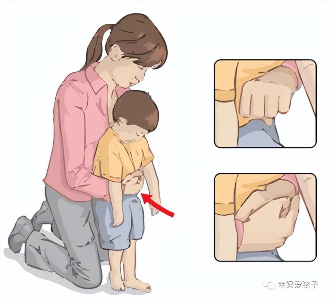 方法2、胸部推击法|在拍背之后,让孩子面朝上,托住其头部、背部,用两个手指尖按压胸部4次。也可以把孩子抱坐在膝上,两手环绕,用食指或中指冲压腹部。注意:抢救婴幼儿时,用力不可太猛,以免造成孩子胸腹部内脏损伤。