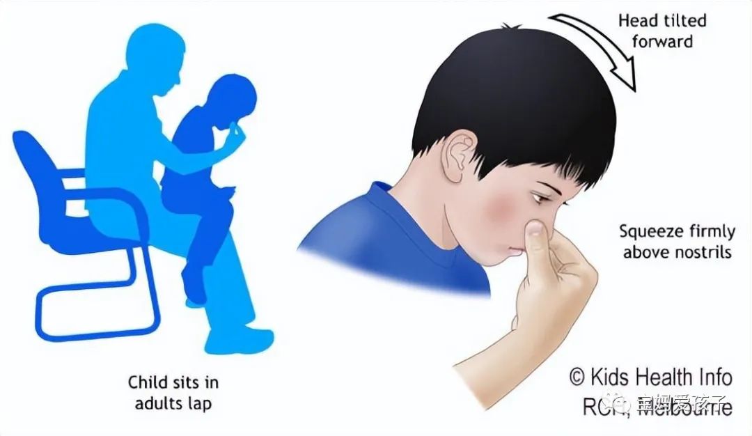 试着让孩子平静下来,因为哭泣会使流血加重,然后按照以下急救说明进行操作:步骤1:让孩子以舒适的姿势直立坐着,并稍微向前倾。步骤2:挤压鼻子下部柔软的部分(不要捏鼻梁),用手指将鼻孔压在一起。继续挤压5~10分钟。步骤3:不要一直移开手指来检查出血是否已经停止,血液需要时间去凝结。读绘本可以很好地分散孩子的注意力。步骤4:定一个10分种的闹钟。10分钟后,松开鼻子,检查流血是否停止。如果流鼻血继续,再挤压10 分钟。